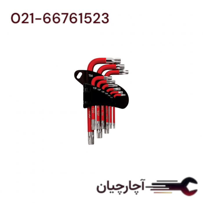 شامل 9 عدد آچار آلن دسته کوتاه ستاره ای سوراخ دار در ابعاد T-10 , T-15 , T-20 , T-25 , T-27 , T-30 , T-40 , T-45 , T-50