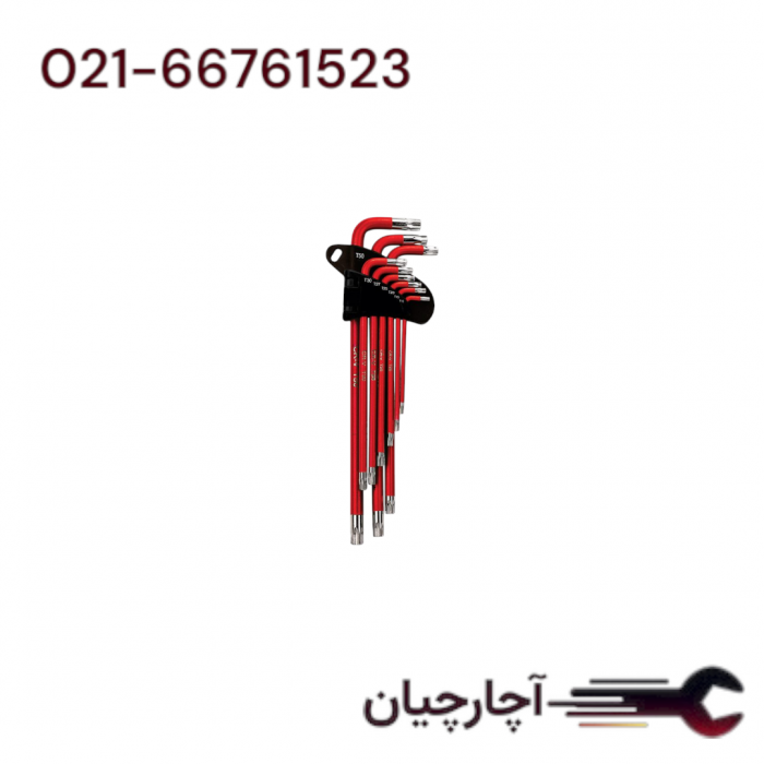 شامل 9 عدد آچار آلن دسته فوق بلند ستاره ای سوراخ دار در ابعاد T-10 , T-15 , T-20 , T-25 , T-27 , T-30 , T-40 , T-45 , T-50
